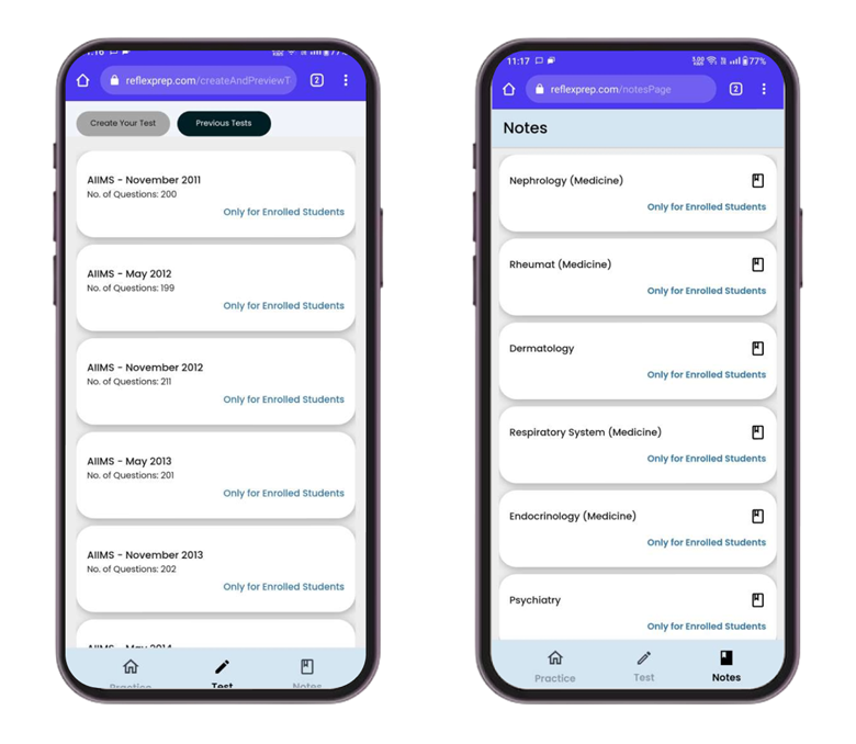 Reflex was developed as an exam preparation app tailored for students preparing for competitive exams like NEET, essential for medical school admissions in India. The app offers features such as timed practice tests, topic-specific quizzes, and performance tracking to help students study effectively.
